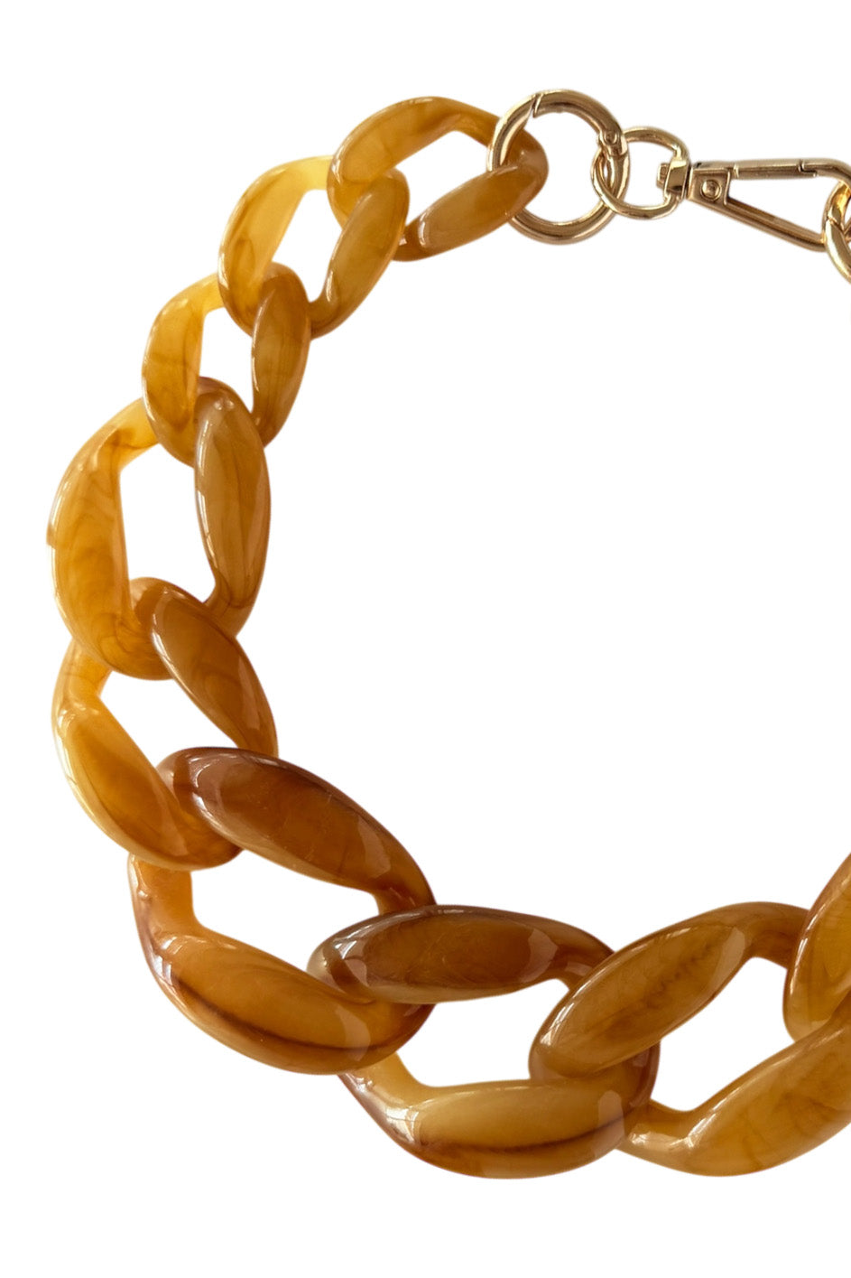 This Ambar necklace features a bold design with large plastic chain links, offering a lightweight yet striking accessory. Its durable construction ensures lasting wear, making it an ideal statement piece for elevating modern and casual looks with ease.
