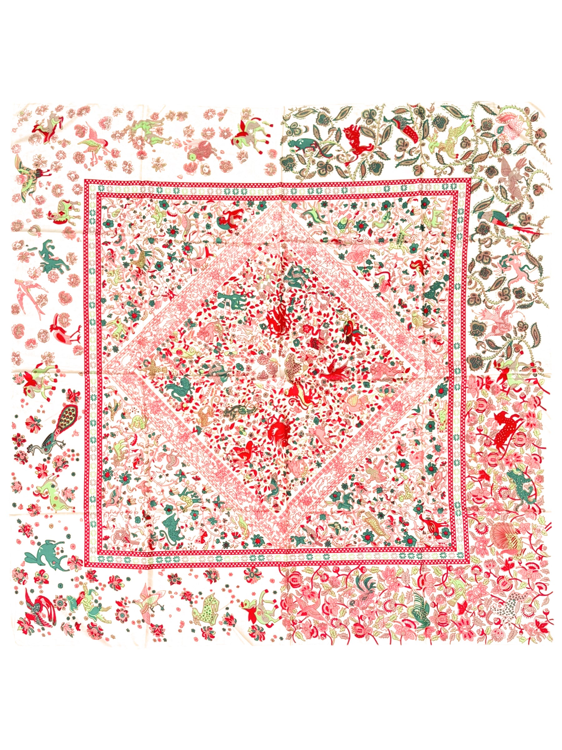 Elevate your wardrobe with this luxurious XL silk shawl in soft ecru, adorned with vibrant red and green motifs. Crafted from silk. Size: 130x130cm 100% Silk